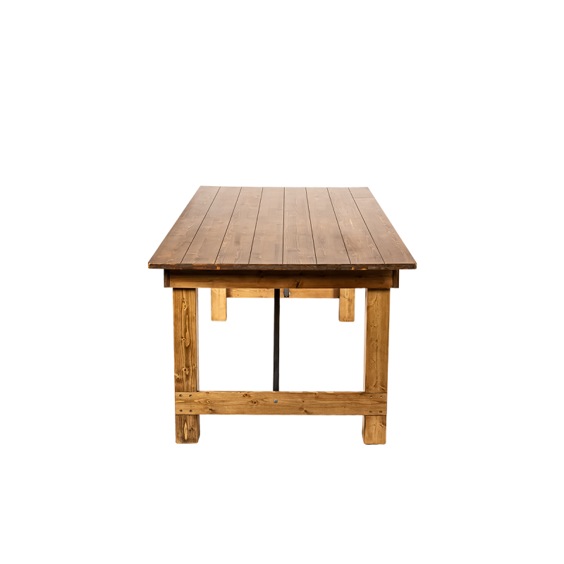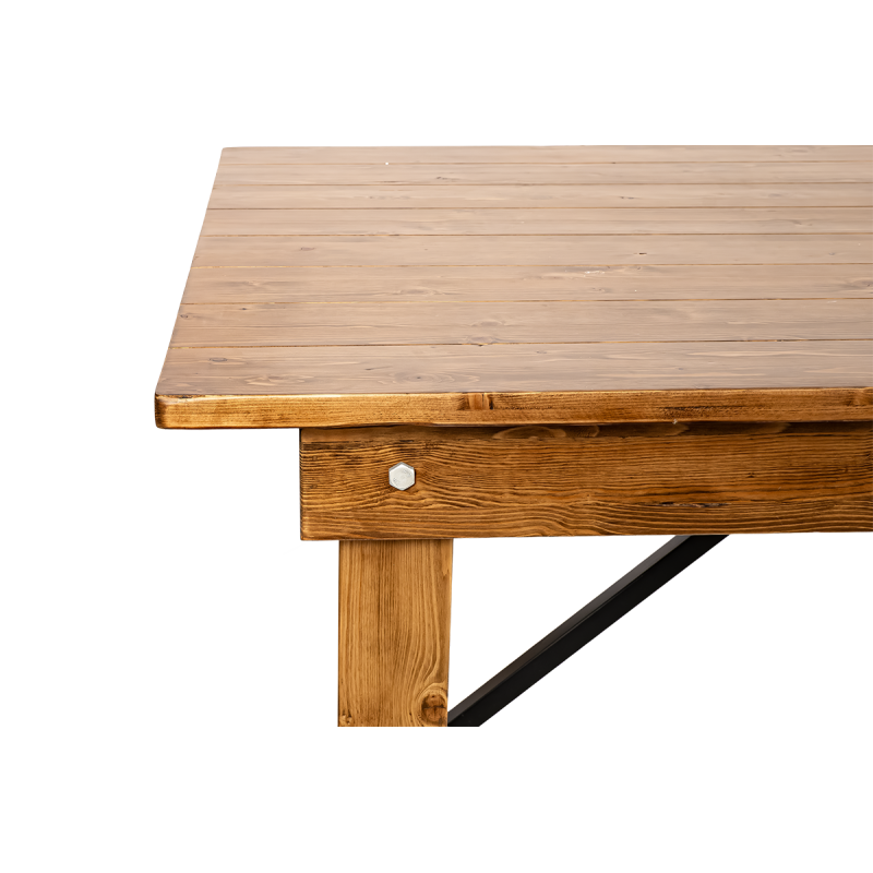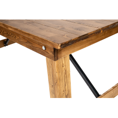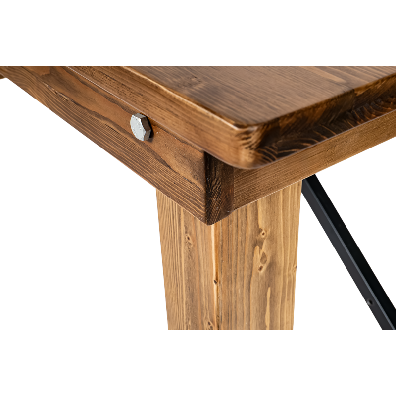 The natural structure of pine highlights the table’s unique charm, bringing warmth and coziness to any interior. Carefully crafted details and visible wood grain give it an authentic, rustic appearance. Metal reinforcements enhance the stability of the structure, ensuring reliability even during large events.